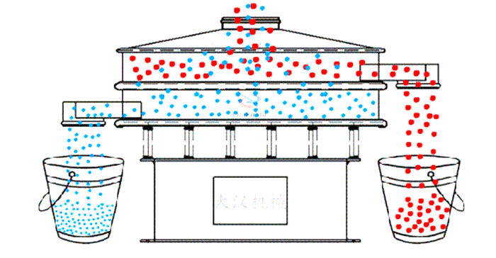 采用立式振動電機作為激振源,通過振動電機上下兩端的偏心重錘將旋轉(zhuǎn)運動轉(zhuǎn)變?yōu)樗健⒋怪薄A斜的三次元運動,并傳遞到旋振篩的篩面上;物料通過入料口進入設備內(nèi),根據(jù)不同物料篩分要求,物料經(jīng)過1-5層采用不同目數(shù)的金屬編織篩網(wǎng)的篩分層,在這個過程中,位于各層的篩網(wǎng)下的清網(wǎng)裝置(硅膠彈跳球)通過頻率振動不斷撞擊篩網(wǎng),使篩網(wǎng)上層物料能夠順暢的透網(wǎng)篩分,并有效解決了物料堵網(wǎng)問題出現(xiàn),不同目數(shù)的物料通過各層對應目數(shù)的篩網(wǎng)后在各層的出料口排出,終實現(xiàn)篩選除雜或過濾分級的目的。
