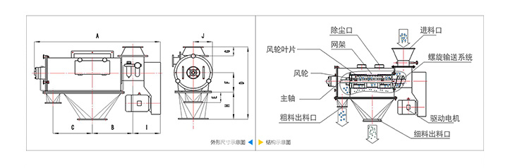氣旋篩篩網(wǎng)為圓筒狀,置于機體內(nèi),物料通過螺旋輸送系統(tǒng)后與氣流混合、霧化進(jìn)入網(wǎng)筒內(nèi),網(wǎng)筒內(nèi)風(fēng)輪葉片連續(xù)轉(zhuǎn)動,使物料同時受到離心力和旋風(fēng)推進(jìn)力,產(chǎn)生運動沖向篩網(wǎng),過網(wǎng)的物料從細(xì)料排出口排出,不能過網(wǎng)的物料繼續(xù)向前從粗料排出口排出,達(dá)到快速分離目的。