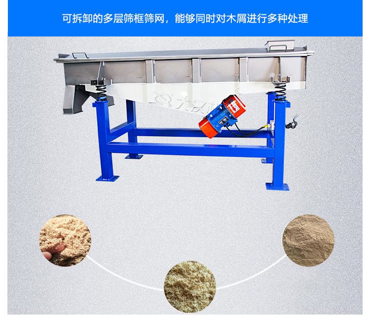 木屑振動(dòng)篩也叫木屑除雜振動(dòng)篩,用于對(duì)木屑進(jìn)行去砂、去粉、去土等的處理。