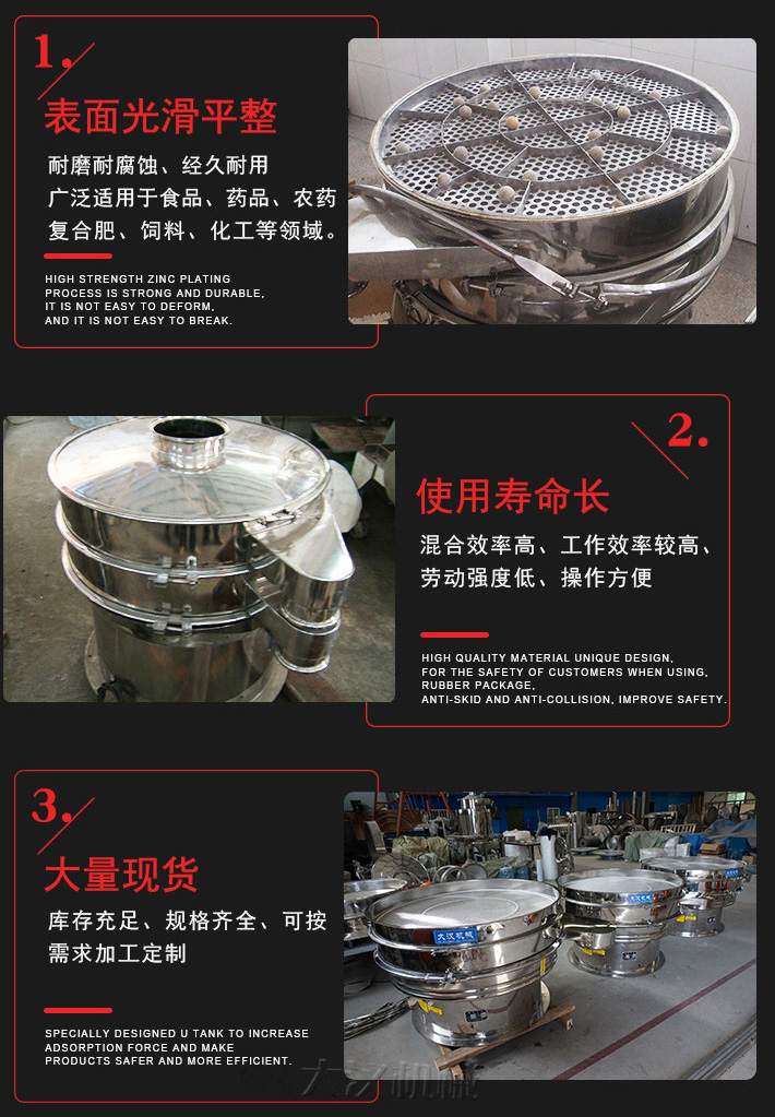 糯米粉旋振篩采用優(yōu)質不銹鋼拋光打磨制成,光滑衛(wèi)生,無死角不掛料。