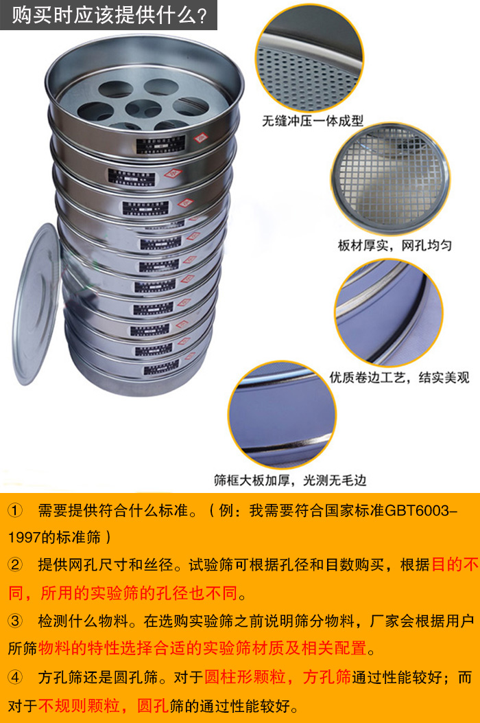 如果您是為實(shí)驗(yàn)室購(gòu)買,則必須要求外表精致美觀實(shí)用,網(wǎng)孔,經(jīng)過(guò)專業(yè)檢測(cè)儀器檢驗(yàn)過(guò)的,符合國(guó)家標(biāo)準(zhǔn)GBT6003-1997或國(guó)際標(biāo)準(zhǔn)ISO3310-1:1990的標(biāo)準(zhǔn)篩。