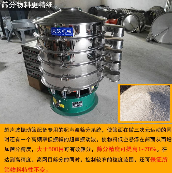 對于一些細(xì)粉、微粉類物料普通的振動篩很難完成的篩分,特別是500目以上的物料,普通的振動篩分機(jī)更難達(dá)到, 因為在篩分中它們?nèi)菀壮霈F(xiàn)結(jié)塊和漏料的情況。超聲波振動篩能很好的避免。超聲波振動篩配備專用的超聲波篩分系統(tǒng),使篩面在做三次元運(yùn)動的同時還有一個高頻率低振幅的超聲振動波,使物料低空懸浮在篩面從而增加篩分精度,篩分精度可提高1~70%。在達(dá)到高精度、高網(wǎng)目篩分的同時,控制較窄的粒度范圍,還可保證所篩物料特性不變。比普通的旋振篩多了一套超聲波發(fā)生裝置,該裝置安裝在網(wǎng)架的下端,可以通過該裝置對較為精細(xì)的物料進(jìn)行篩分,物料不僅受到振動電機(jī)的振動,而且還受到超聲波換能器的機(jī)械振動,因此篩分物料較為精細(xì)。