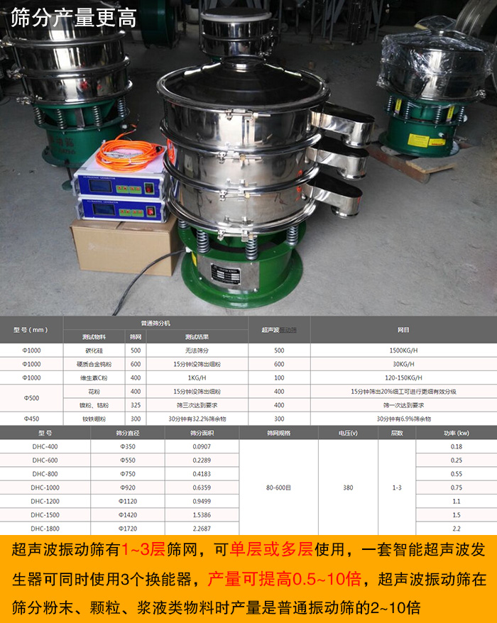 超聲波振動篩有1~3層篩網(wǎng),可單層或多層使用,一套智能超聲波發(fā)生器可同時使用3個換能器,產(chǎn)量可提高0.5~10倍,超聲波振動篩在篩分粉末、顆粒、漿液類物料時產(chǎn)量是普通振動篩的2~10倍。而且為了盡可能滿足各行業(yè)對精細(xì)篩分的需求,超聲波振動篩的型號種類多樣,不同型號的超聲波振動篩對應(yīng)著不同的篩分面積,相應(yīng)的篩分效率、處理量也相差很大,可以完全滿足不同行業(yè)的細(xì)粉篩分需求。