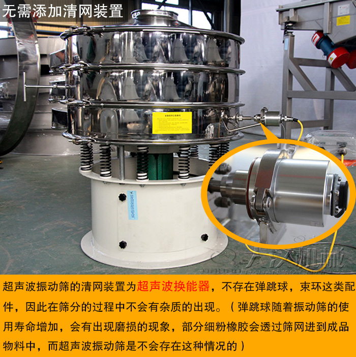 超聲波振動篩的清網(wǎng)裝置為超聲波換能器,不存在彈跳球,束環(huán)這類配件,因此在篩分的過程中不會有雜質(zhì)的出現(xiàn)。(彈跳球隨著振動篩的使用壽命增加,會有出現(xiàn)磨損的現(xiàn)象,部分細(xì)粉橡膠會透過篩網(wǎng)進(jìn)到成品物料中,而超聲波振動篩是不會存在這種情況的)