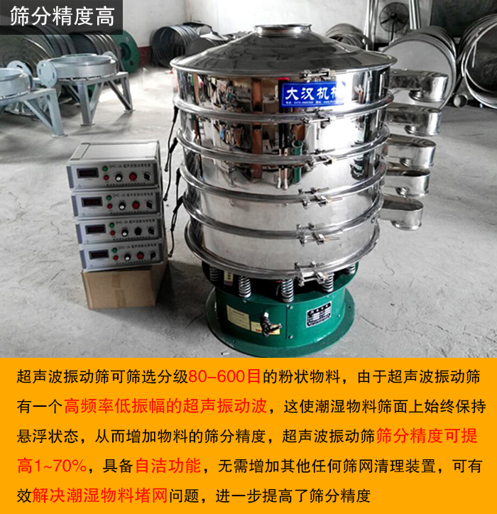 超聲波振動(dòng)篩可篩選分級(jí)80-600目的粉狀物料,由于超聲波振動(dòng)篩有一個(gè)高頻率低振幅的超聲振動(dòng)波,這使潮濕物料篩面上始終保持懸浮狀態(tài),從而增加物料的篩分精度,超聲波振動(dòng)篩篩分精度可提高1~70%,具備自潔功能,無需增加其他篩網(wǎng)清理裝置,可有效解決潮濕物料堵網(wǎng)問題,進(jìn)一步提高了篩分精度。
