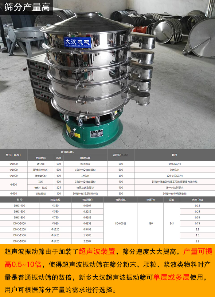 超聲波振動(dòng)篩由于加裝了超聲波裝置,篩分速度大大提高,產(chǎn)量可提高0.5~10倍,使得超聲波振動(dòng)篩在篩分粉末、顆粒、漿液類物料時(shí)產(chǎn)量是普通振動(dòng)篩的數(shù)倍,新鄉(xiāng)大漢超聲波振動(dòng)篩可單層或多層使用,用戶可根據(jù)篩分產(chǎn)量的需求進(jìn)行選擇。