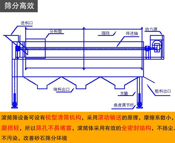 滾筒篩設(shè)備可設(shè)有梳型清篩機(jī)構(gòu),在篩分過(guò)程中,不管進(jìn)入篩分筒的物料多臟、多雜都可以篩分,從而提高了該系列振動(dòng)篩的篩分效率,非常適合篩分砂石。滾筒篩是由電動(dòng)機(jī)通過(guò)減速器、聯(lián)軸器驅(qū)動(dòng)傾斜安裝于機(jī)架上的滾筒繞其軸線轉(zhuǎn)動(dòng)的,正是由于滾筒篩采用這種滾動(dòng)輸送的原理,摩擦系數(shù)小,磨損輕,所以篩孔不易堵塞,滾筒體采用有效的全密封結(jié)構(gòu),不揚(yáng)塵、不污染,改善砂石篩分環(huán)境。