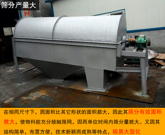 在相同尺寸下,圓面積比其它形狀的面積都大,因此其篩分有效面積就大,使物料能充分接觸篩網(wǎng),因而單位時(shí)間內(nèi)篩分量就大。又因其結(jié)構(gòu)簡(jiǎn)單,布置方便,技術(shù)新穎而成熟等特點(diǎn),極易大型化。