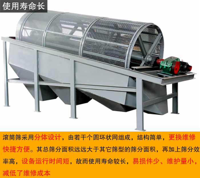 滾筒篩采用分體設(shè)計(jì),由若干個(gè)圓環(huán)狀網(wǎng)組成,結(jié)構(gòu)簡(jiǎn)單,更換維修快捷方便。其總篩分面積遠(yuǎn)遠(yuǎn)大于其它篩型的篩分面積,再加上篩分效率高,設(shè)備運(yùn)行時(shí)間短,故而使用壽命較長(zhǎng),易損件少、維護(hù)量小,減低了維修成本。