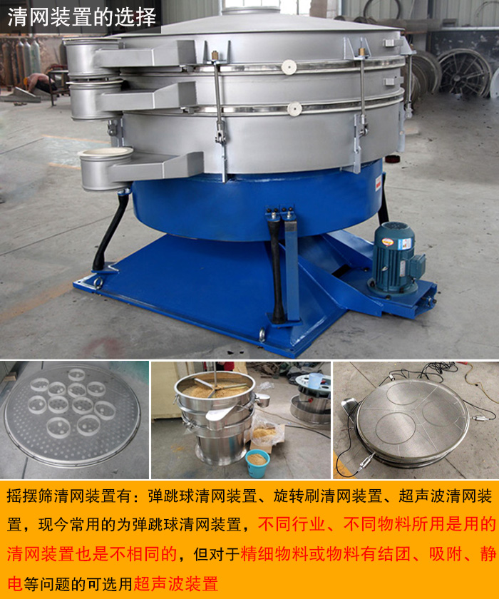 搖擺篩清網(wǎng)裝置有:彈跳球清網(wǎng)裝置、旋轉刷清網(wǎng)裝置、超聲波清網(wǎng)裝置,現(xiàn)今常用的為彈跳球清網(wǎng)裝置,不同行業(yè)、不同物料所用是用的清網(wǎng)裝置也是不相同的,但對于精細物料或物料有結團、吸附、靜電等問題的可選用超聲波裝置。