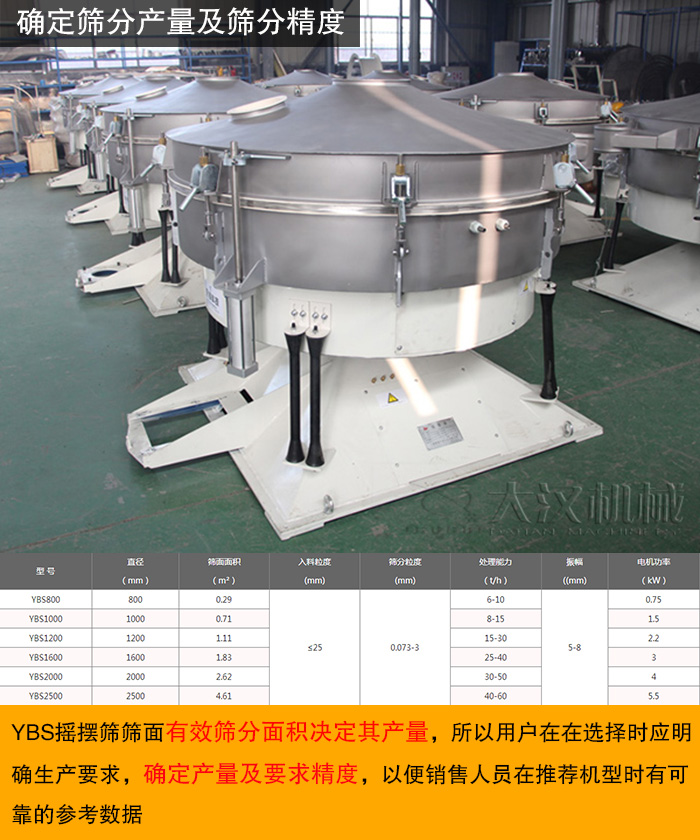 YBS搖擺篩篩面有效篩分面積決定其產(chǎn)量,所以用戶在在選擇時應明確生產(chǎn)要求,確定產(chǎn)量及要求精度,以便銷售人員在推薦機型時有可靠的參考數(shù)據(jù)。