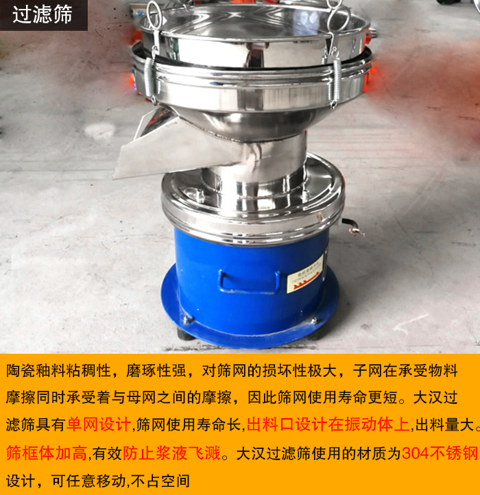 陶瓷釉料粘稠性,磨琢性強,對篩網(wǎng)的損壞性極大,子網(wǎng)在承受物料摩擦同時承受著與母網(wǎng)之間的摩擦,因此篩網(wǎng)使用壽命更短。大漢過濾篩具有單網(wǎng)設(shè)計,篩網(wǎng)使用壽命長,出料口設(shè)計在振動體上,出料量大。篩框體加高,有效防止?jié){液飛濺。大漢過濾篩使用的材質(zhì)為304不銹鋼設(shè)計,可任意移動,不占空間。