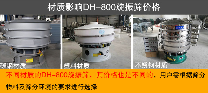 DH-800旋振篩材質(zhì)分為三種,即碳鋼材質(zhì)、不銹鋼材質(zhì)、塑料材質(zhì)。不同材質(zhì)的DH-800旋振篩,其價格也是不同的,用戶需根據(jù)篩分物料及篩分環(huán)境的要求進(jìn)行選擇。