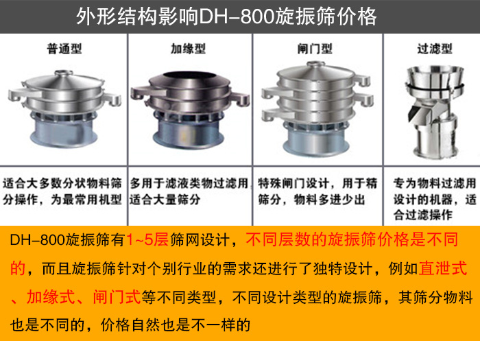 DH-800旋振篩有1~5層篩網(wǎng)設(shè)計,不同層數(shù)的旋振篩價格是不同的,而且旋振篩針對個別行業(yè)的需求還進(jìn)行了獨特設(shè)計,例如直泄式、加緣式、閘門式等不同類型,不同設(shè)計類型的旋振篩,其篩分物料也是不同的,價格自然也是不一樣的。
