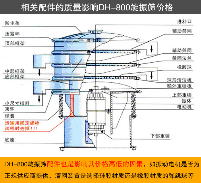 DH-800旋振篩配件也是影響其價格高低的因素,如振動電機是否為正規(guī)供應(yīng)商提供,清網(wǎng)裝置是選擇硅膠材質(zhì)還是橡膠材質(zhì)的彈跳球等。