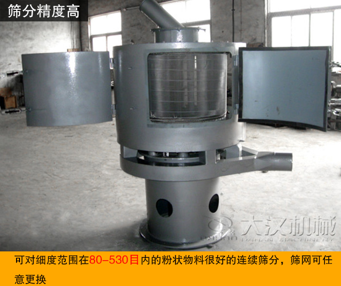 氣流篩是一種對(duì)微細(xì)粉進(jìn)行有網(wǎng)篩分的高精度篩分設(shè)備,可對(duì)細(xì)度范圍在80-530目?jī)?nèi)的粉狀物料很好的連續(xù)篩分,篩網(wǎng)可任意更換。