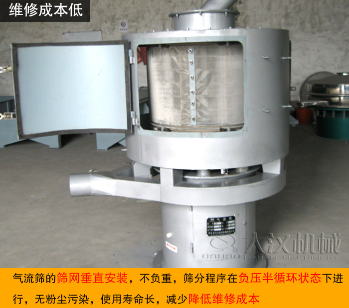 氣流篩的篩網(wǎng)垂直安裝,不負(fù)重,篩分程序在負(fù)壓半循環(huán)狀態(tài)下進(jìn)行,無(wú)粉塵污染,使用壽命長(zhǎng),減少降低維修成本。