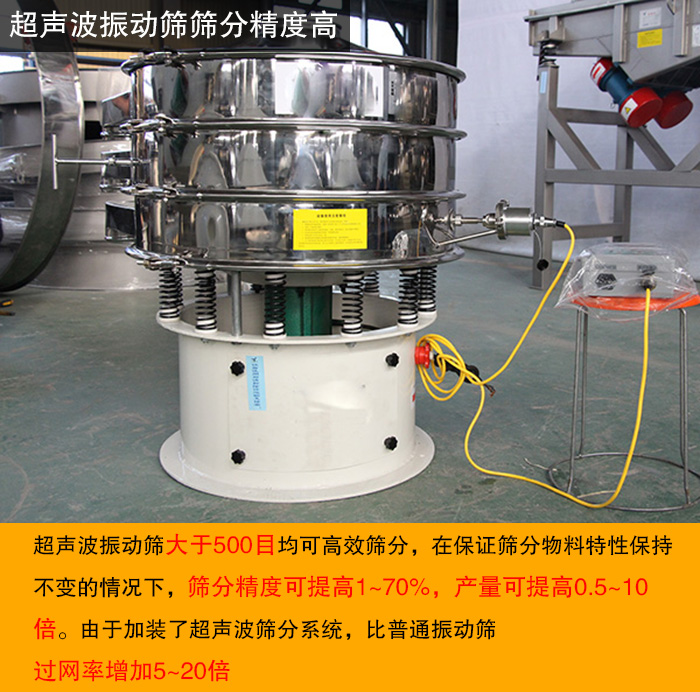 超聲波振動(dòng)篩大于500目均可高效篩分,在保證篩分物料特性保持不變的情況下,篩分精度可提高1~70%,產(chǎn)量可提高0.5~10倍。由于加裝了超聲波篩分系統(tǒng),可有效分解粘附物質(zhì),減少篩上物,比普通振動(dòng)篩過網(wǎng)率增加5~20倍。