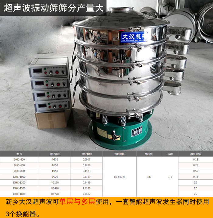 新鄉(xiāng)大漢超聲波可單層與多層使用,一套智能超聲波發(fā)生器同時(shí)使用3個(gè)換能器,具備自潔功能,無網(wǎng)孔堵塞現(xiàn)象,對(duì)于一些難篩分的物料有著良好的篩分效果。