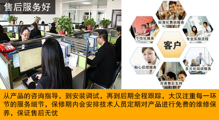 大漢公司采用一站式服務(wù)體系,從產(chǎn)品的咨詢指導(dǎo),到安裝調(diào)試,再到后期全程跟蹤,大漢注重每一環(huán)節(jié)的服務(wù)細(xì)節(jié),致力于為客戶解決一切疑難問題,保修期內(nèi)會安排技術(shù)人員定期對產(chǎn)品進行免費的維修保養(yǎng),保證售后無憂。