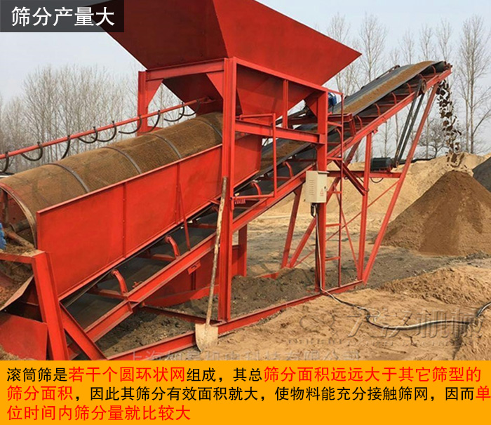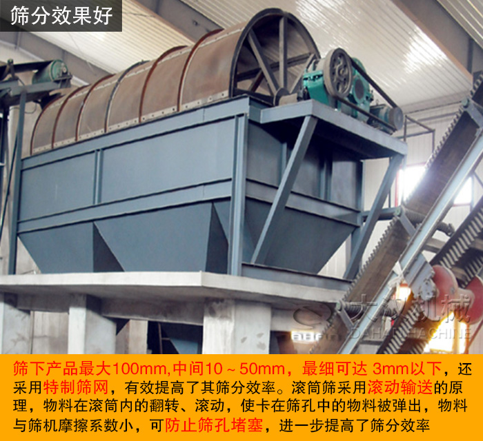 滾筒篩是若干個圓環(huán)狀網(wǎng)組成,其總篩分面積遠遠大于其它篩型的篩分面積,因此其篩分有效面積就大,使物料能充分接觸篩網(wǎng),因而單位時間內(nèi)篩分量就比較大。又因為滾筒篩結(jié)構(gòu)簡單,布置方便,技術(shù)新穎而成熟等特點,極易大型化。