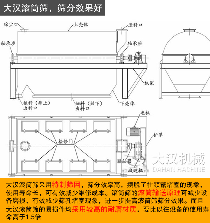 一件設(shè)備都是用來(lái)服務(wù)生產(chǎn)的,大漢滾筒篩采用特制篩網(wǎng),篩分效率高,擺脫了往頻繁堵塞的現(xiàn)象,使用壽命長(zhǎng),可有效減少維修成本。滾筒篩的滾筒輸送原理可減少設(shè)備磨損,有效減少篩孔堵塞現(xiàn)象,進(jìn)一步提高滾筒篩篩分效果。而且大漢滾筒篩的易損件均采用較高的耐磨材質(zhì),要比以往設(shè)備的使用壽命高于1.5倍。