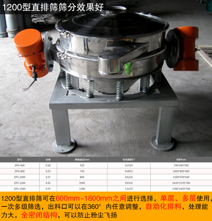 1200型直排篩的兩臺振動電機(jī)對稱安裝在直排篩兩側(cè),振動電機(jī)上、下端裝有偏心重錘將振動電機(jī)的旋轉(zhuǎn)運動變?yōu)樗健⒋怪薄A斜以及離心作用的多作用力重疊,再將這種作用力傳遞給篩面,從而達(dá)到篩分的目的。1200型直排篩可在600mm~1800mm之間進(jìn)行選擇,單層、多層使用,一次多級篩選,出料口可以在360°內(nèi)任意調(diào)整,自動化排料,處理能力大,全密閉結(jié)構(gòu),可以防止粉塵飛揚。