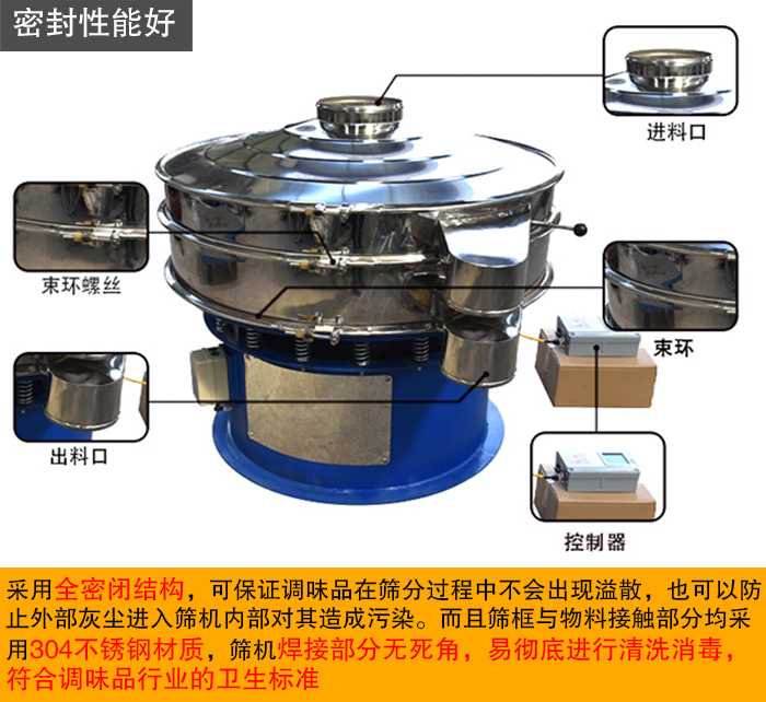 三次元振動(dòng)篩采用全密閉結(jié)構(gòu),可保證調(diào)味品在篩分過程中不會(huì)出現(xiàn)溢散,也可以防止外部灰塵進(jìn)入篩機(jī)內(nèi)部對其造成污染。而且篩框與物料接觸部分均采用304不銹鋼材質(zhì),篩機(jī)焊接部分無死角,易進(jìn)行清洗消毒,符合調(diào)味品行業(yè)的衛(wèi)生標(biāo)準(zhǔn)。