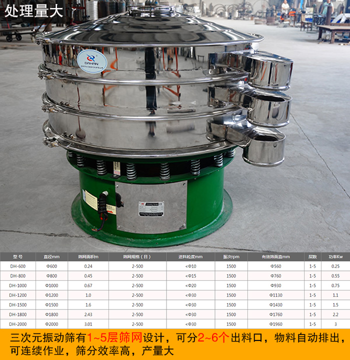 三次元振動(dòng)篩有1~5層篩網(wǎng)設(shè)計(jì),可分2~6個(gè)出料口,物料自動(dòng)排出,可連續(xù)作業(yè),篩分效率高,產(chǎn)量大,可滿足不同用戶對調(diào)味品產(chǎn)量的要求。