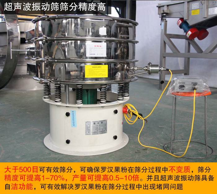由于羅漢果粉易吸潮,且有粘性,使用普通旋振篩極易出現(xiàn)堵網(wǎng)的現(xiàn)象,所以大漢廠家推薦大家使用超聲波振動(dòng)篩。