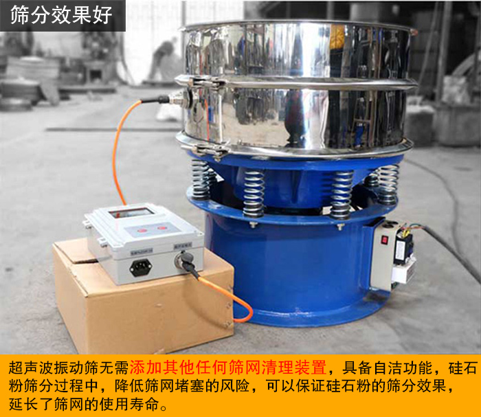 超聲波振動(dòng)篩是將220V、50Hz或110V、60Hz電能轉(zhuǎn)化為18KHz的高頻電能,輸入超聲換能器,將其變成18KHz機(jī)械振動(dòng),大大提高了振動(dòng)篩的各種效果,從而達(dá)到高效篩分和清網(wǎng)的目的。超聲波振動(dòng)篩無(wú)需添加其他篩網(wǎng)清理裝置,具備自潔功能,硅石粉篩分過(guò)程中,降低篩網(wǎng)堵塞的風(fēng)險(xiǎn),可以保證硅石粉的篩分效果,延長(zhǎng)了篩網(wǎng)的使用壽命。