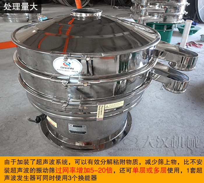 超聲波振動(dòng)篩由于加裝了超聲波系統(tǒng),可以有效分解粘附物質(zhì),減少篩上物,比不安裝超聲波的振動(dòng)篩過(guò)網(wǎng)率增加5-20倍,還可單層或多層使用,1套超聲波發(fā)生器可同時(shí)使用3個(gè)換能器。