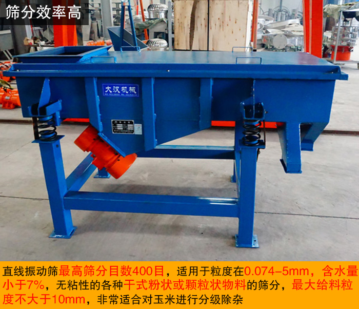 直線振動(dòng)篩高篩分目數(shù)400目,適用于粒度在0.074-5mm,含水量小于7%,無(wú)粘性的各種干式粉狀或顆粒狀物料的篩分,大給料粒度不大于10mm,非常適合對(duì)玉米進(jìn)行分級(jí)除雜。