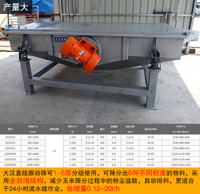 大漢直線振動(dòng)篩可1~5層分級(jí)使用,可篩分出6種不同粒度的物料,采用全封閉結(jié)構(gòu),減少玉米篩分過(guò)程中的粉塵溢散,自動(dòng)排料,更適合于24小時(shí)流水線作業(yè),處理量0.12-20t/h。