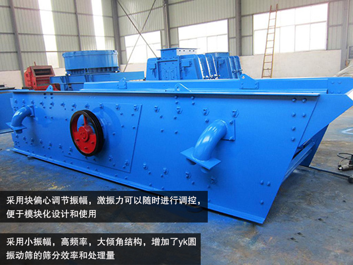 yk圓振動(dòng)篩采用塊偏心調(diào)節(jié)振幅,不僅使激振器偏心質(zhì)量單重激振力增大,而且激振力可以隨時(shí)進(jìn)行調(diào)控,便于模塊化設(shè)計(jì)和使用,還采用小振幅,高頻率,大傾角結(jié)構(gòu),增加了yk圓振動(dòng)篩的篩分效率和處理量。