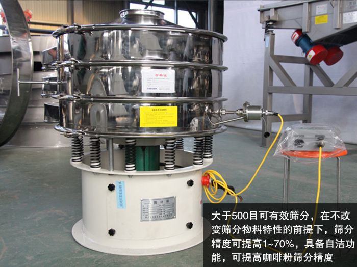 大漢超聲波振動(dòng)篩大于500目可有效篩分,在不改變篩分物料特性的前提下,篩分精度可提高1~70%,可以有效保證咖啡粉的篩分精度。而且,由于超聲波振動(dòng)篩加裝了超聲波篩分系統(tǒng),從而具備自潔功能,無需增加其他篩網(wǎng)清理裝置,進(jìn)一步提高了咖啡粉的篩分精度。