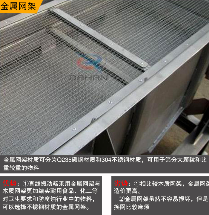 優(yōu)勢:①直線振動(dòng)篩采用金屬網(wǎng)架與木質(zhì)網(wǎng)架更加結(jié)實(shí)耐用,篩網(wǎng)更加緊繃,可以保證直線振動(dòng)篩的篩分質(zhì)量。
