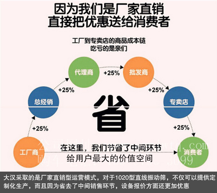 大漢采取的是廠家直銷型運營模式,對于1020型直線振動篩,不僅可以提供定制化生產,而且因為省去了中間銷售環(huán)節(jié),設備報價方面還更加優(yōu)惠,保證讓您以較低的價格購得滿意的直線振動篩設備。