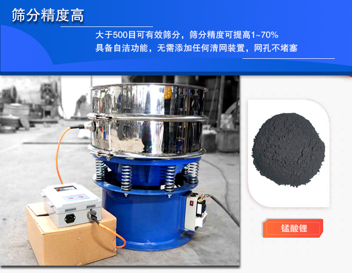 大漢超聲波振動(dòng)篩大于500目可有效篩分,能清晰的分離直徑鄰近的細(xì)微顆粒,在不改變物料的特性的情況下,篩分精度可提高1~70%,具備自潔功能,無需添加清網(wǎng)裝置,網(wǎng)孔不堵塞。采用全密閉結(jié)構(gòu),可保證錳酸鋰在篩分過程中不被污染,進(jìn)一步提高了其篩分精度。