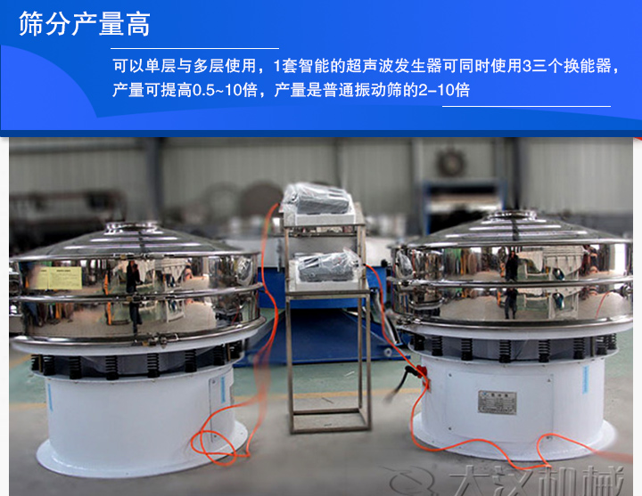 超聲波振動(dòng)篩可以單層與多層使用,1套智能的超聲波發(fā)生器可同時(shí)使用3三個(gè)換能器,產(chǎn)量可提高0.5~10倍,產(chǎn)量是普通振動(dòng)篩的2-10倍。