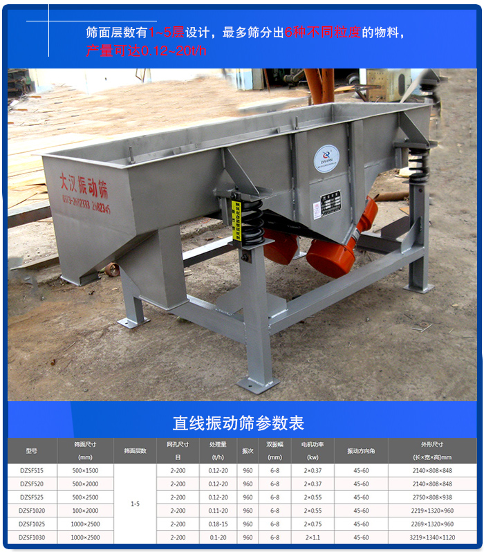由于直線振動篩采用雙電機驅(qū)動,所以和其他類型振動篩相比,其特點和優(yōu)勢更加明顯。大漢直線振動篩篩面層數(shù)有1~5層設(shè)計,多篩分出6種不同粒度的物料,產(chǎn)量可達0.12~20t/h。