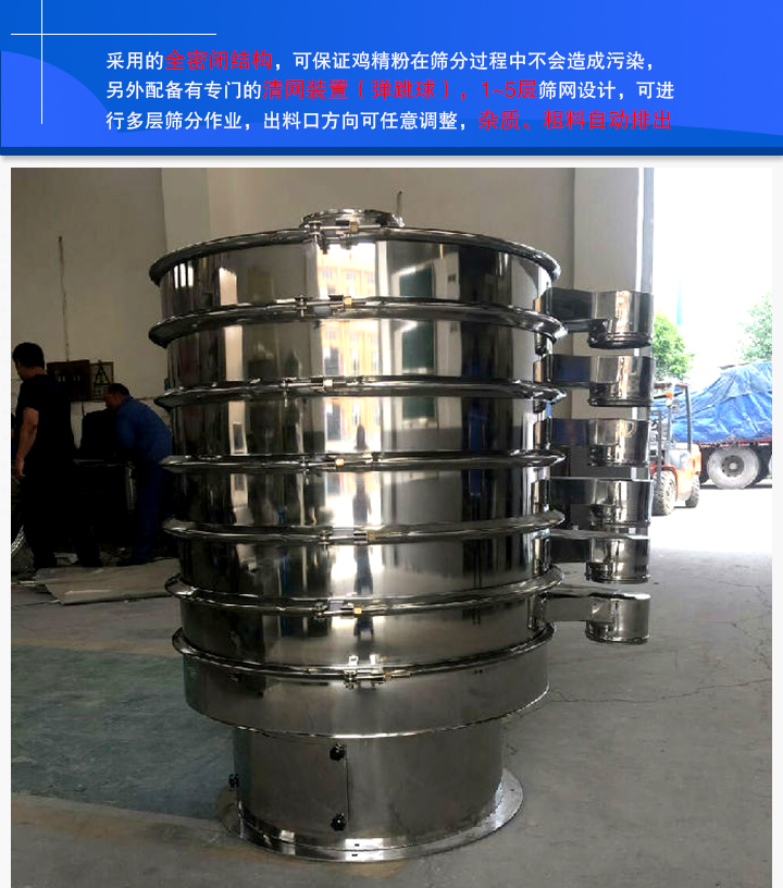 食品振動(dòng)篩采用的全密閉結(jié)構(gòu),可保證雞精粉在篩分過程中不會(huì)造成污染,另外配備有專門的清網(wǎng)裝置(彈跳球),1~5層篩網(wǎng)設(shè)計(jì),可進(jìn)行多層篩分作業(yè),出料口方向可任意調(diào)整,雜質(zhì)、粗料自動(dòng)排出,可連續(xù)作業(yè),篩分效率高。