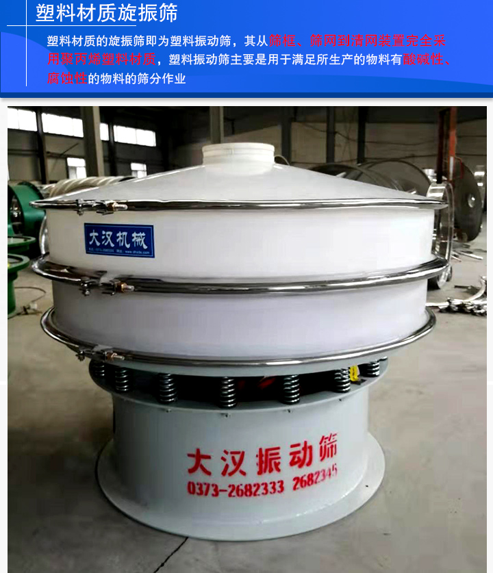 塑料材質(zhì)的旋振篩即為塑料振動篩,其從篩框、篩網(wǎng)到清網(wǎng)裝置完全采用聚丙烯塑料材質(zhì),塑料振動篩主要是用于滿足所生產(chǎn)的物料有酸堿性、腐蝕性的物料的篩分作業(yè),排除了一些特殊物料與金屬接觸會產(chǎn)生化學(xué)反應(yīng)的問題。