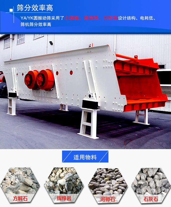YA/YK圓振動篩激振器采用偏心形式,不僅使激振器偏心質量單重激振力增大,而且激振力可隨機調控,處理量大,便于模塊化設計和使用,適合石料廠大產量的篩分需求。而且,YA/YK圓振動篩可以與其他配套設備組合,組成全套石料廠生產線設備,更多地理解客戶個性化的篩分需求。
