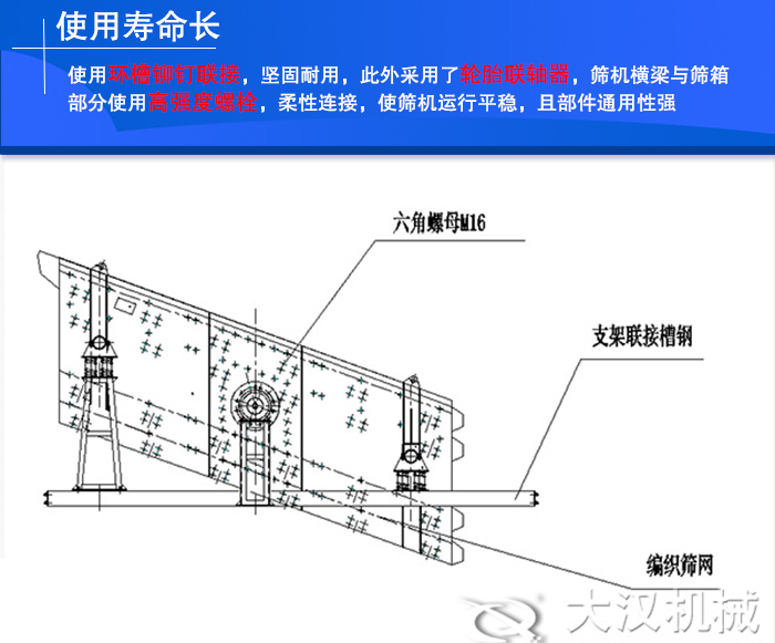 YA/YK圓振動篩使用環(huán)槽鉚釘聯接,堅固耐用,此外采用了輪胎聯軸器,篩機橫梁與篩箱部分使用高強度螺栓,柔性連接,使篩機運行平穩(wěn),且部件通用性強,維修快捷方便,使用壽命長。
