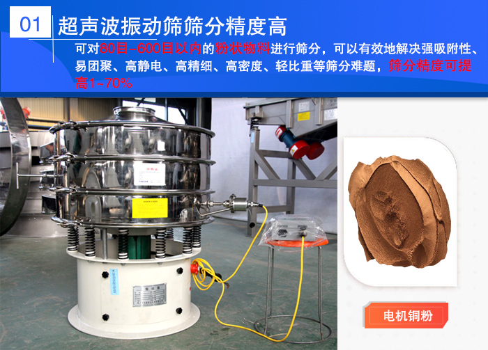 超聲波振動篩可對80目-600目以內(nèi)的粉狀物料進(jìn)行篩分,可以有效地解決強(qiáng)吸附性、易團(tuán)聚、高靜電、高精細(xì)、高密度、輕比重等篩分難題,篩分精度可提高1~70%,可對電解銅粉進(jìn)行高精度篩分。