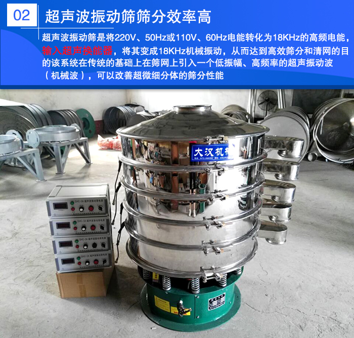 超聲波振動篩是將220V、50Hz或110V、60Hz電能轉(zhuǎn)化為18KHz的高頻電能,輸入超聲換能器,將其變成18KHz機(jī)械振動,從而達(dá)到高效篩分和清網(wǎng)的目的該系統(tǒng)在傳統(tǒng)的基礎(chǔ)上在篩網(wǎng)上引入一個低振幅、高頻率的超聲振動波(機(jī)械波),可以改善超微細(xì)分體的篩分性能,超聲波振動篩無需增加清網(wǎng)裝置,篩分效率高。
