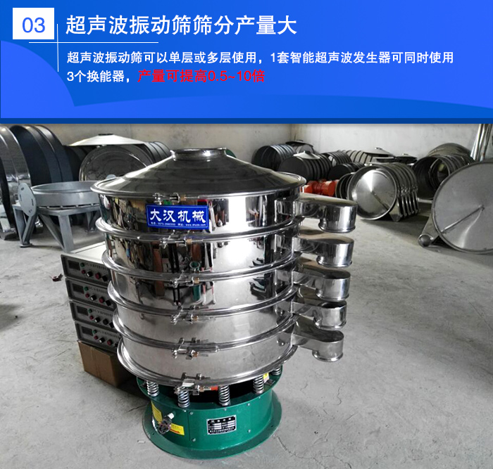 超聲波振動篩可以單層或多層使用,1套智能超聲波發(fā)生器可同時使用3個換能器,產(chǎn)量可提高0.5~10倍。