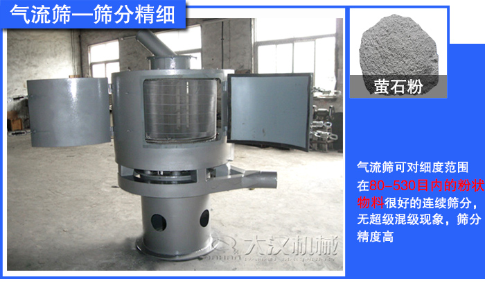 氣流篩可與各種磨機(jī),風(fēng)路并網(wǎng)配套使用,可長(zhǎng)時(shí)間運(yùn)作,產(chǎn)量是普通振動(dòng)篩的5-10倍或更高,可滿足螢石粉用戶高產(chǎn)量的要求。
