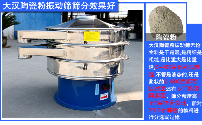 大漢陶瓷粉振動(dòng)篩無論物料是干是濕,是精細(xì)是粗糙,是比重大是比重輕,0-400目都可以篩選,不管是液態(tài)的,還是漿狀的0-600目都可以過濾,還有專門的清網(wǎng)裝置,篩分精度高,1至5層篩網(wǎng)設(shè)計(jì),能對(duì)2至6個(gè)等級(jí)的物料進(jìn)行分選或過濾,自動(dòng)化排料,處理量大。